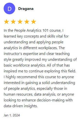 This is another positive review of my People Analytics course, but this time, it goes to the FREE People Analytics 101 Blueprint.