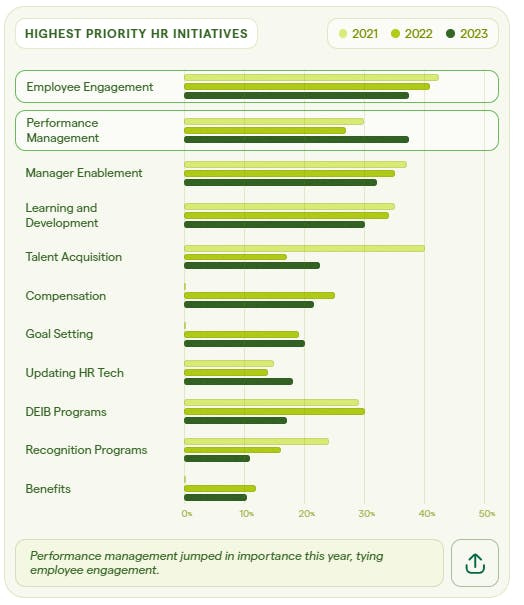 According to the survey, we see Engagement, Performance, and Manager Enablement in the 3 top spots as priorities for the future.