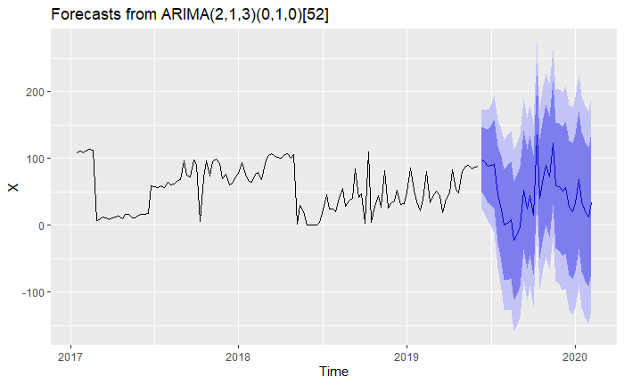 In essence, though this graph told us that we normally range between 0 and 100, the ARIMA (one of the most prominent and well-known forecasting models) created a prediction between -150 and 200.