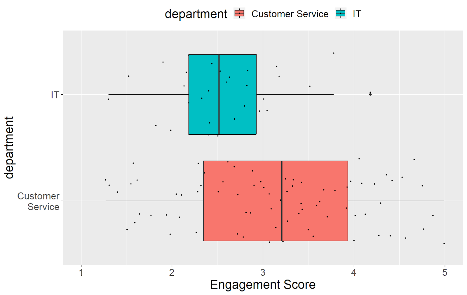We can easily see that Customer Success employees have a higher average and variability in their engagement scores than IT employees.